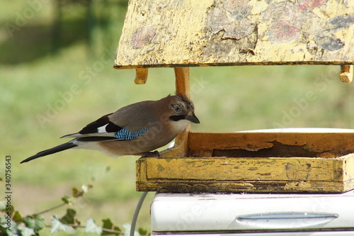 Sójka ,ptak sójka ,sójka w karmiku ,dokarmianie dzikich ptaków , jedzący ptak