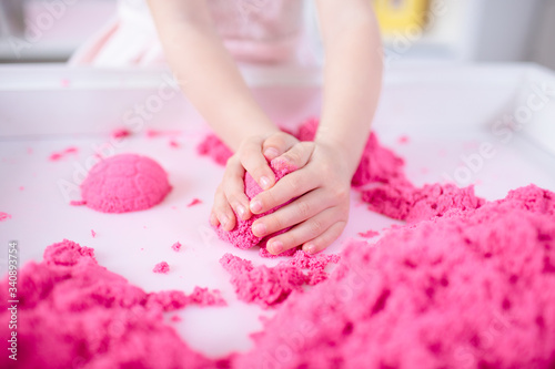 Pink magic sand in a kids hands on a white background close up. Early sensory education. Preparing for School. Development