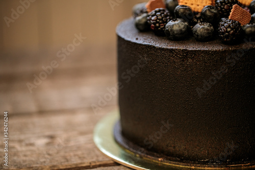 Black velour cake with fresh berries (blackberry, blueberry) is on a wooden table. Closeup foto of cake. There is a place for logo and text.