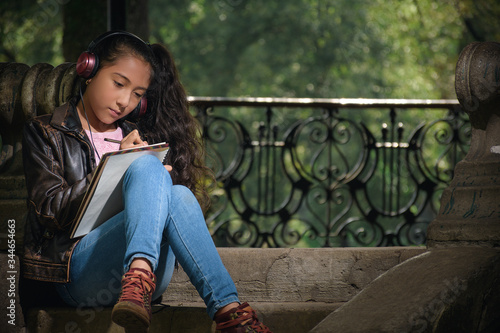 niña bonita leyendo en el parque, adolescente bonita tomando el sol en el parque y esta leyendo, niña sentada en el parque estudiando