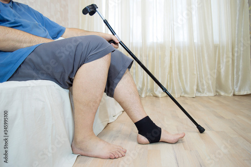 A man sitting on a couch with a crutch and a fixing bandage on his leg. Injury to the foot, damage to the ligaments of the lower limb, rehabilitation. Medicine and health. Side view, selective focus.