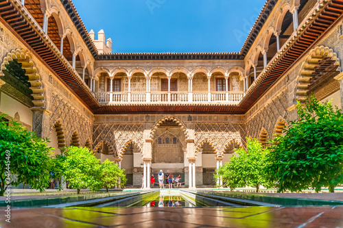 Moorish architecture of beautiful castle called Real Alcazar in Seville, Spain