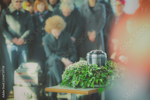 A metal urn with ashes of a dead person on a funeral, with people mourning in the background on a memorial service. Sad grieving moment at the end of a life. Last farewell to a person in an urn.
