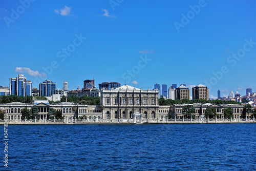 Panorama of Istanbul. On the banks of the Bosphorus Strait a luxurious old palace with delicate decorations and gratings. Far away are the modern buildings. Clear blue sky.