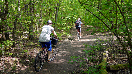 Rowerzyści w lesie podczas pandemii COVID-19. Spędzanie wolnego czasu w epoce koronawirusa. Profilaktyka i obostrzenia epidemiczne, zachowanie odległości, rowerowe wycieczki i spacery w pustym lesie.
