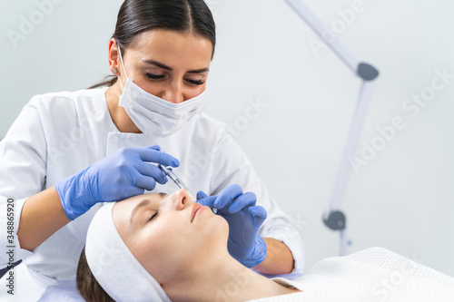 Dermatologist injecting a cheek filler to a woman