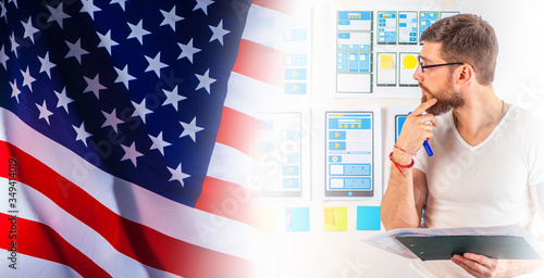 A man is developing a mobile app. Mobile app designer on the background of the American flag. A man is developing a website for an American company. Remote work.
