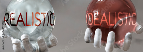 idealistic and realistic in a balanced life - pictured as words idealistic,realistic in hands to show that realistic and idealistic should stay in balance, 3d illustration