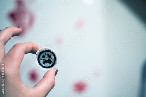 Cover with printer ink tray in hand, sad face on the inner surface of the printer paint cover