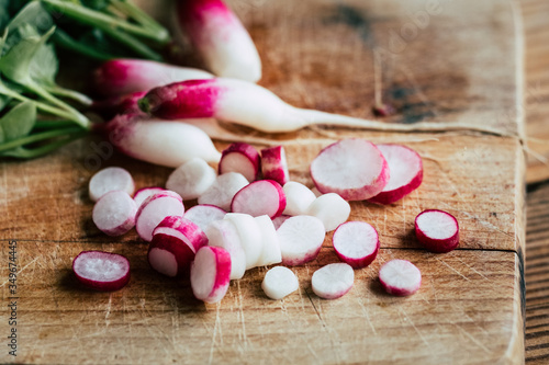 Radis découpés en lamelles sur une planche en bois - Préparation des radis