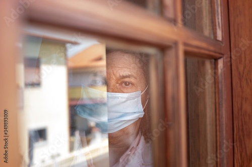 Ritratto di anziana che guarda dalla finestra di casa sua con l mascherina e aria triste