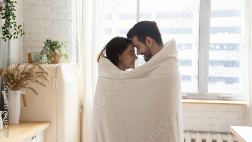 Happy young husband and wife stand hugging cuddling wrapped in cover enjoy tender sweet moment at home, loving millennial couple warm up together in kitchen share spend romantic weekend indoors