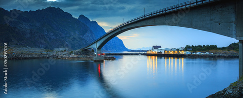 Panorama on the coast and Henningsvaer bridge at Lofoten in Norway