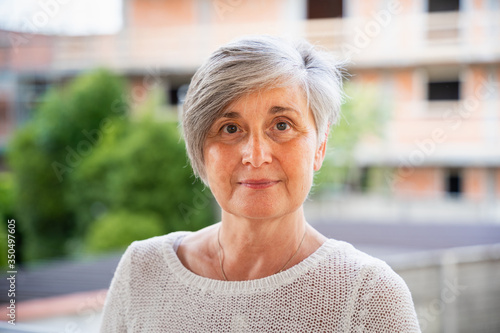 Portrait of a friendly mature woman with gray hair in the city - Concept of tranquility and serenity in a moment of pause from busy life