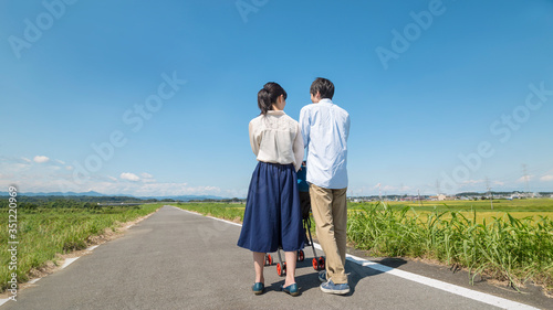 自然の中ベビーカーを押し散歩する若い夫婦の後ろ姿