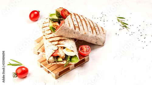 Burritos wraps with asparagus, cherry tomatoes, avocado, chicken fillet on a light background, top view. burrito, mexican food