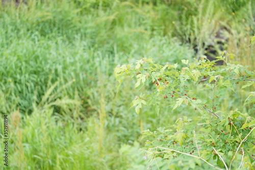 雨上がりの休日に散歩道で出会った緑の美しい植物の写真