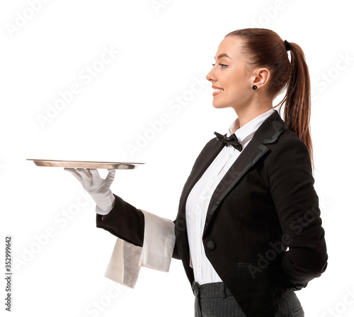 Little waiter stands with empty tray serving on Isolated transparent background png. generated with AI