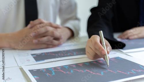 Accountants and financiers are brainstorming the analysis of revenue performance with stock graphs at meetings, Analysis of real estate investment and income tax data concept.