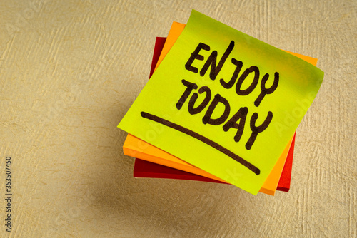 Enjoy today reminder - handwriting on a sticky note, positive attitude and mindset concept