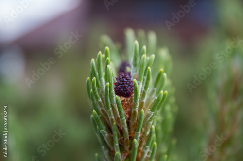 Kosodrzewina zbliżenie na szyszkę, rozmyte tło, wiosna