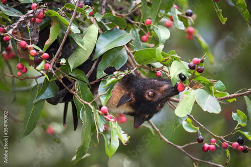A Spectacled Flying Fox enjoying native small-fruited figs in Kuranda, Queensland. A threatened species, they are often disliked by locals, but are keystone pollinators of the rainforest.