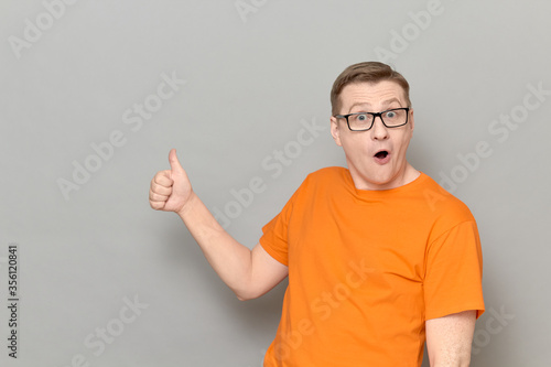 Portrait of amazed impressed man raising thumb up in approval gesture