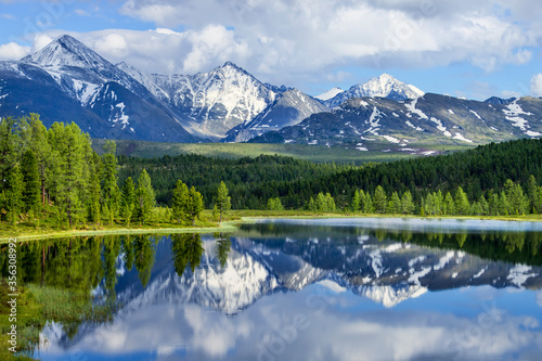 Wild mountain lake in the Altai mountains, summer landscape, beautiful reflection