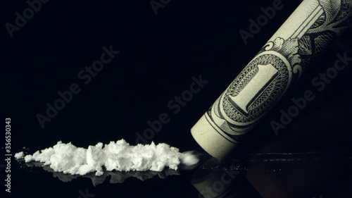 Line of cocaine being snorted up rolled up dollar bill on black reflective table top.