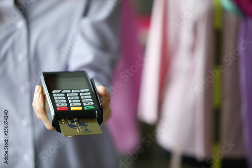 Close-up of person holding terminal with plastic credit card. Cashier machine to withdrawals finance. Nfc technology counter. Copy space in right side. Contactless payment concept