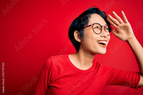 Young beautiful asian girl wearing casual t-shirt and glasses over isolated red background very happy and smiling looking far away with hand over head. Searching concept.
