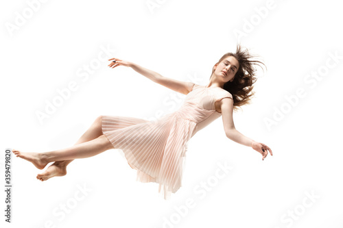 Mid-air beauty cought in moment. Full length shot of attractive young woman hovering in air and keeping eyes closed. Levitating in free falling, lack of gravity. Freedom, emotions, artwork concept.