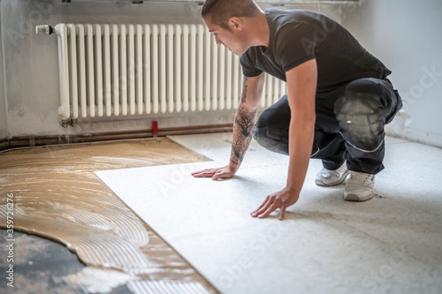 Handwerker verlegt spezielle Platten, um einen Höhenunterschied in einer Altbauwohnung auszugleichen, um anschließend darauf Parkett zu verlegen