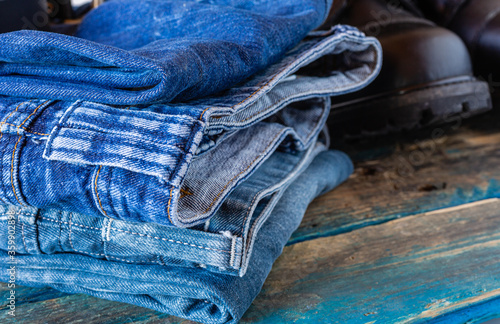 Jeansy i glany. Skora i jeansy. Garderoba meska. Zlozone spodnie. Na starych deskach.