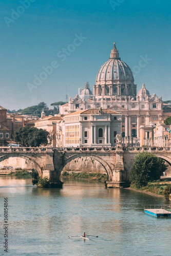 Rome, Italy. Man Training On Kayak Near Aelian Bridge. Papal Basilica Of St. Peter In The Vatican