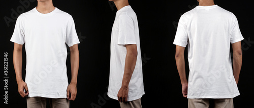 white t-shirt Front and back, mock up templates for Premium Photo print designs. model photoshoot in the studio using a black background.
