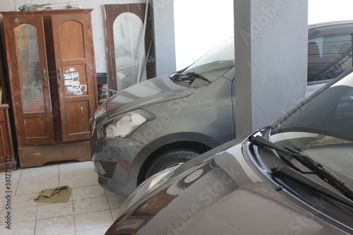 Close-up detail body part of grey car parking in the home. Photo of grey car in low light.