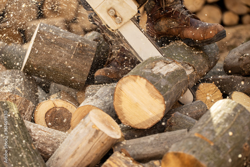 Chainsaw in action cutting wood. Man cutting wood with saw, dust and movements. Chainsaw. Close-up of woodcutter sawing chain saw in motion, sawdust fly to sides.
