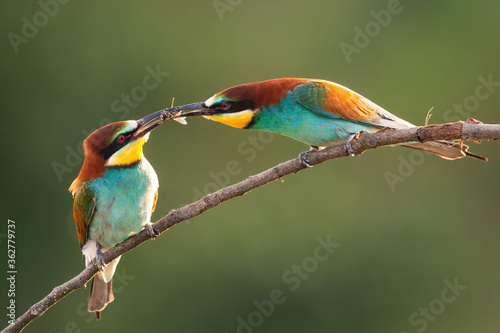 European bee-eater, merops apiaster, feeding on twig during the summer. Two bird in love courting on branch. Colorful animals catching insect in summertime.