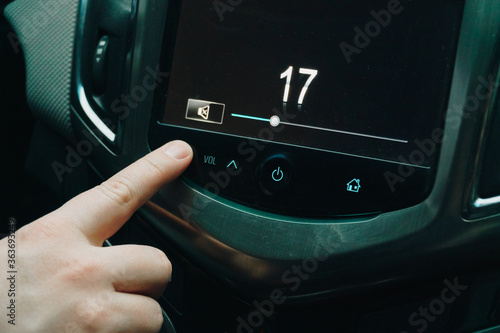 the man turns the sound up and down in the car