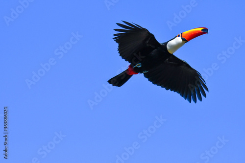 Toco Toucan flying with open wings in the clear blue sky. Large tropical Amazon tucan in flight