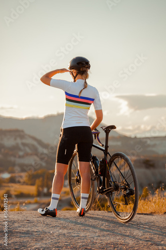 Fit young female cyclist, standing with her bike in hand, admiring the scenery. She has her back to the camera. Full shot, back view.