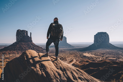Back view of man with backpack standing on rock looking at high beautiful scenery view in dry desert lands of Monument Valley,male traveler wanderlust getting to destination exploring wild environment