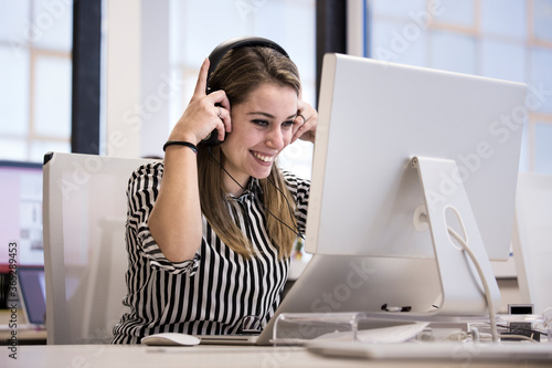 Giovane impiegata bionda sorridente , in camicia a righe seduta nella sua postazione lavorativa del suo ufficio lavora al computer indossando delle cuffie