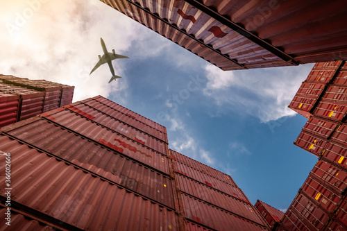 Airplane flying above container logistic. Cargo and shipping business. Container ship for import and export logistic. Logistic industry from port to port. Container at harbor for truck transport.