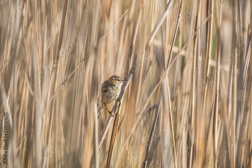 Ptak na trzcinie Rokitniczka Acrocephalus schoenobaenus, ptak który bardzo głośno śpiewa