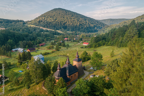Gorlice, Zabykowy kościół w miejscowości Kunkowa widziany z lotu ptaka. Beskid Niski