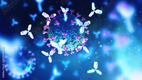 Antibodies attacking SARS-CoV-2 virus, 3D illustration for Chinese coronavirus COVID19 treatment, diagnosis and prevention