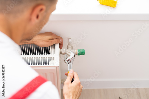 A man saws off a pipe with a circular saw, flying sparks, replacement of the radiator in the apartment, plumbing work