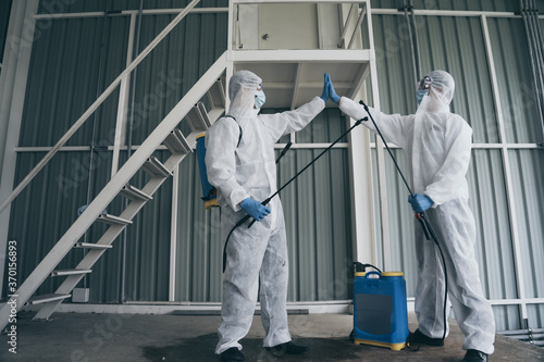 Team in virus protective suite and mask encourage and hands together to cleaning covid19 infected area , Virus disinfection concept